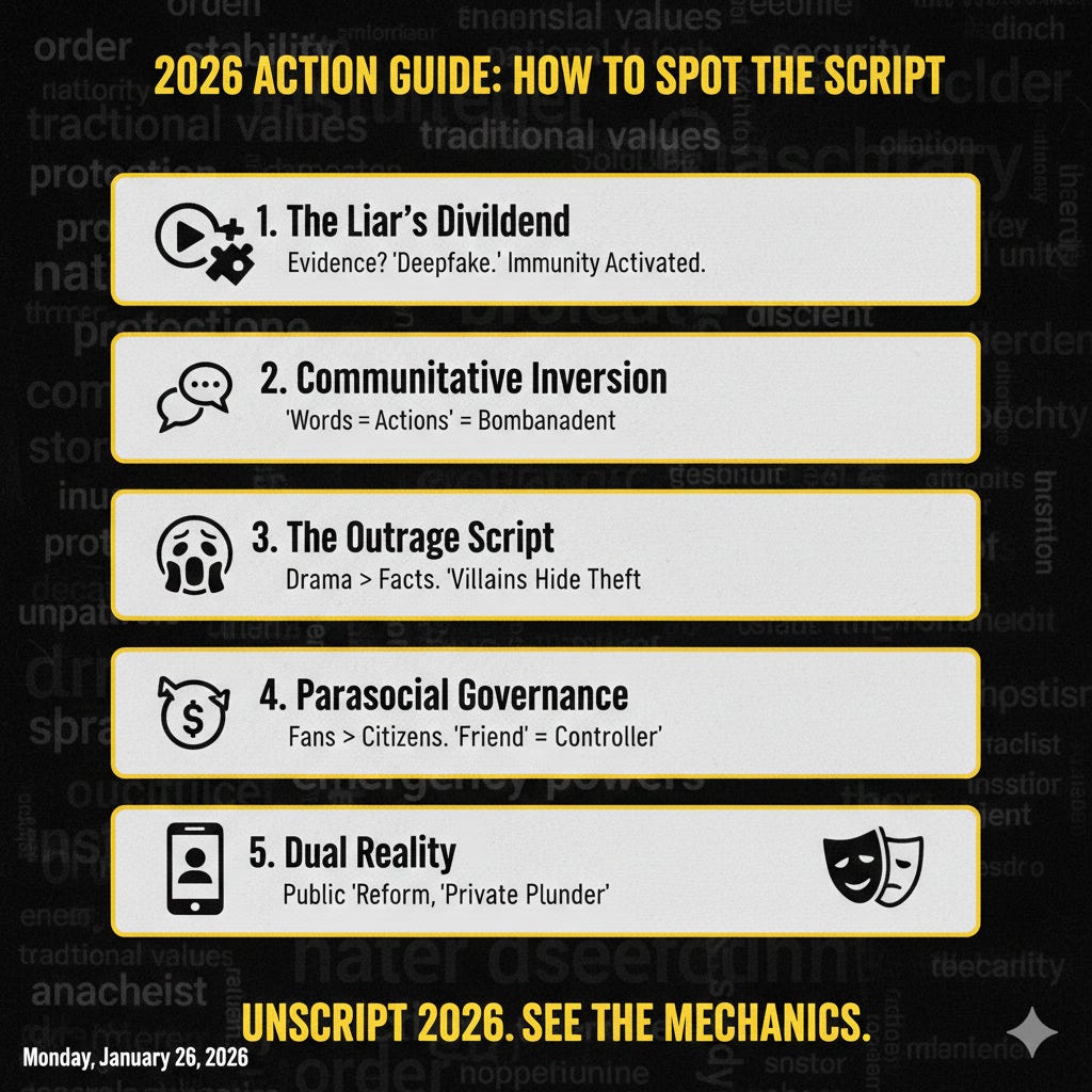 4. Watch for Parasocial Governance: When a leader uses "friendly" media to make you feel like a "fan" rather than a "citizen," they are casting you in their show.